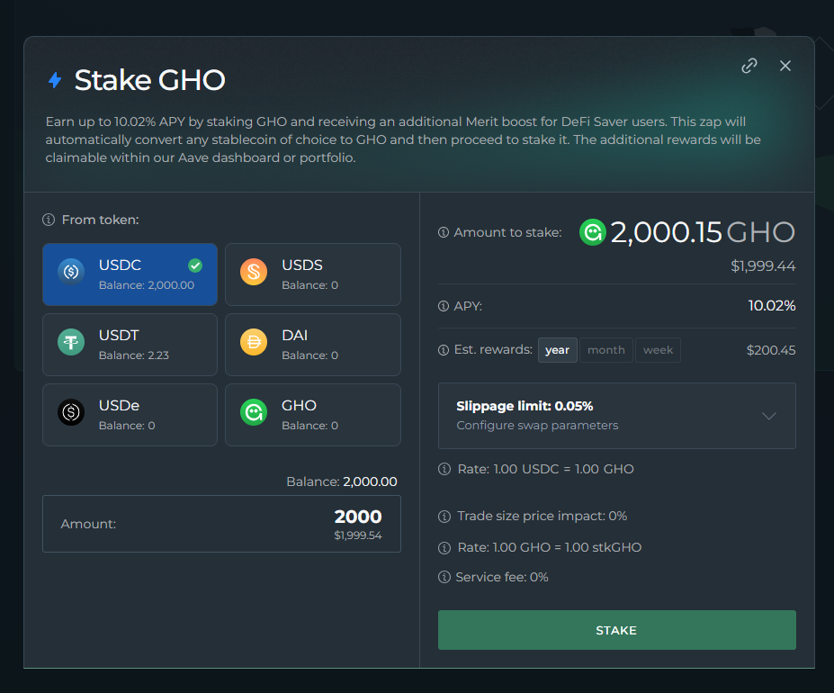If you're interested in staking USDS (in Sky) or GHO (in Aave), we have dedicated zaps that, in one transaction, let you select which asset you'd like to swap into USDS / GHO (if you don't already own them), and stake them in the relevant protocol.