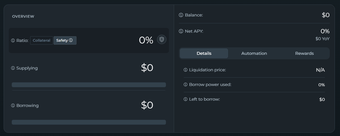 The "Automations" tab will show you any activate automations you may have for your position, while "Rewards" will show you any claimable that might be available.