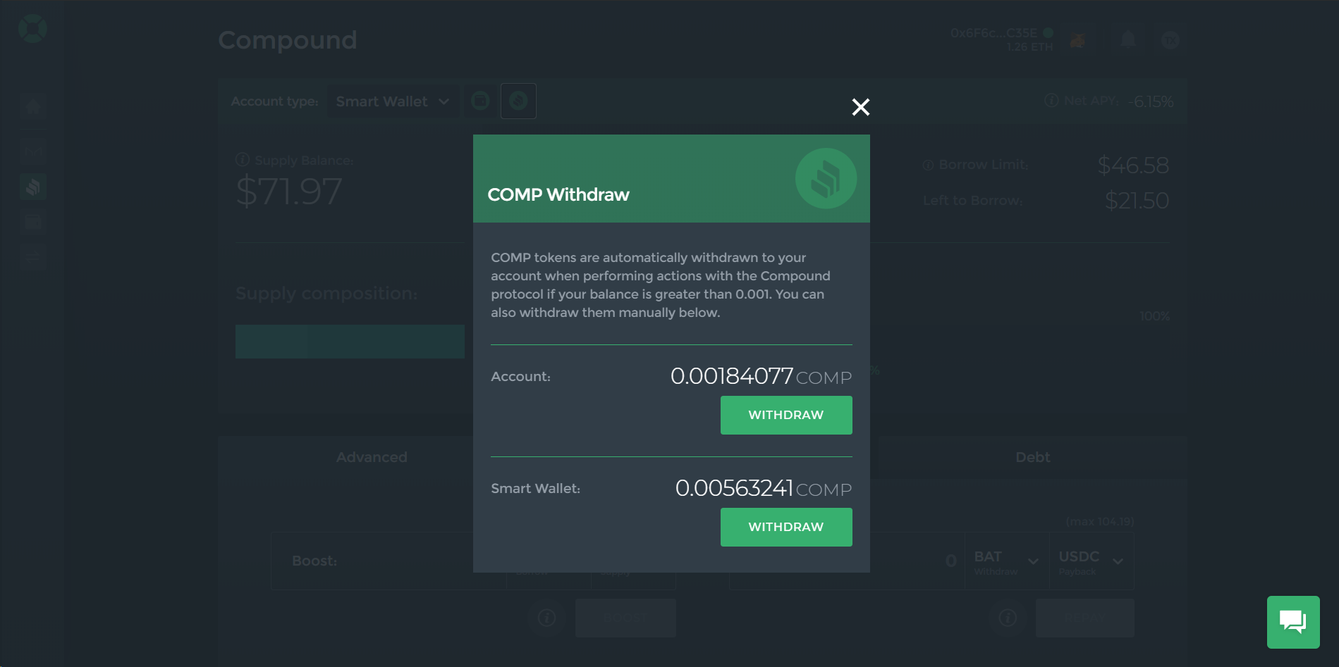> However, since both our Smart Savings and Compound dashboards utilize the Smart Wallet to interact with the Compound protocol, your earned COMP tokens will actually get withdrawn to your Smart Wallet instead to your original account.