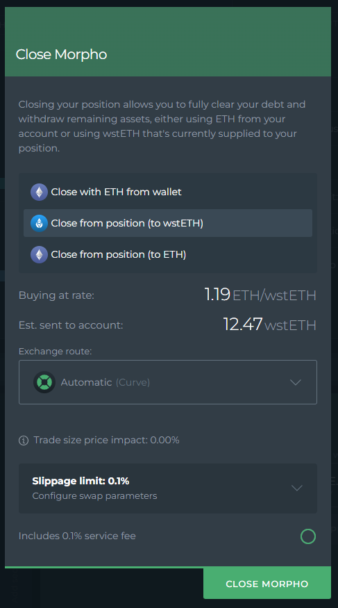*The "Close (to X)" represents which asset will be withdrawn to your EOA wallet once the position is fully closed.*\