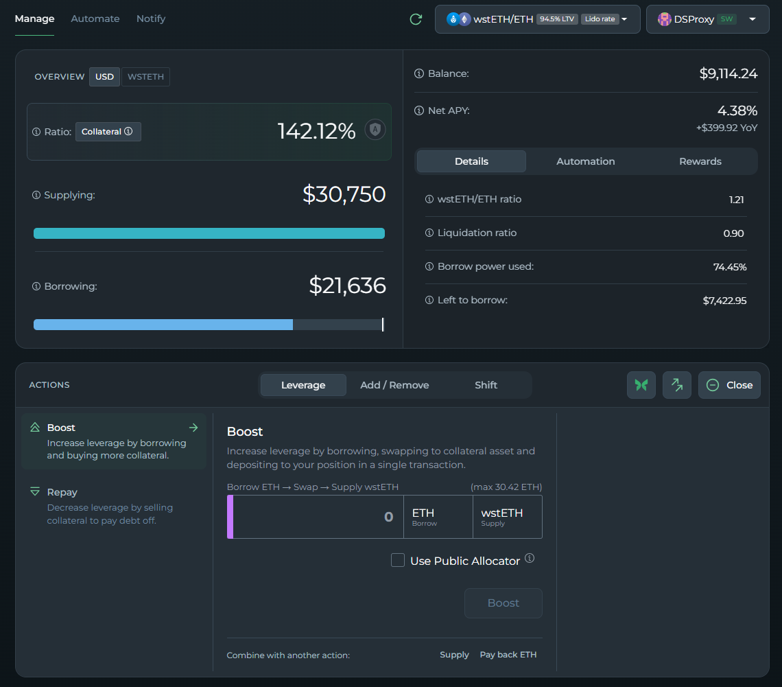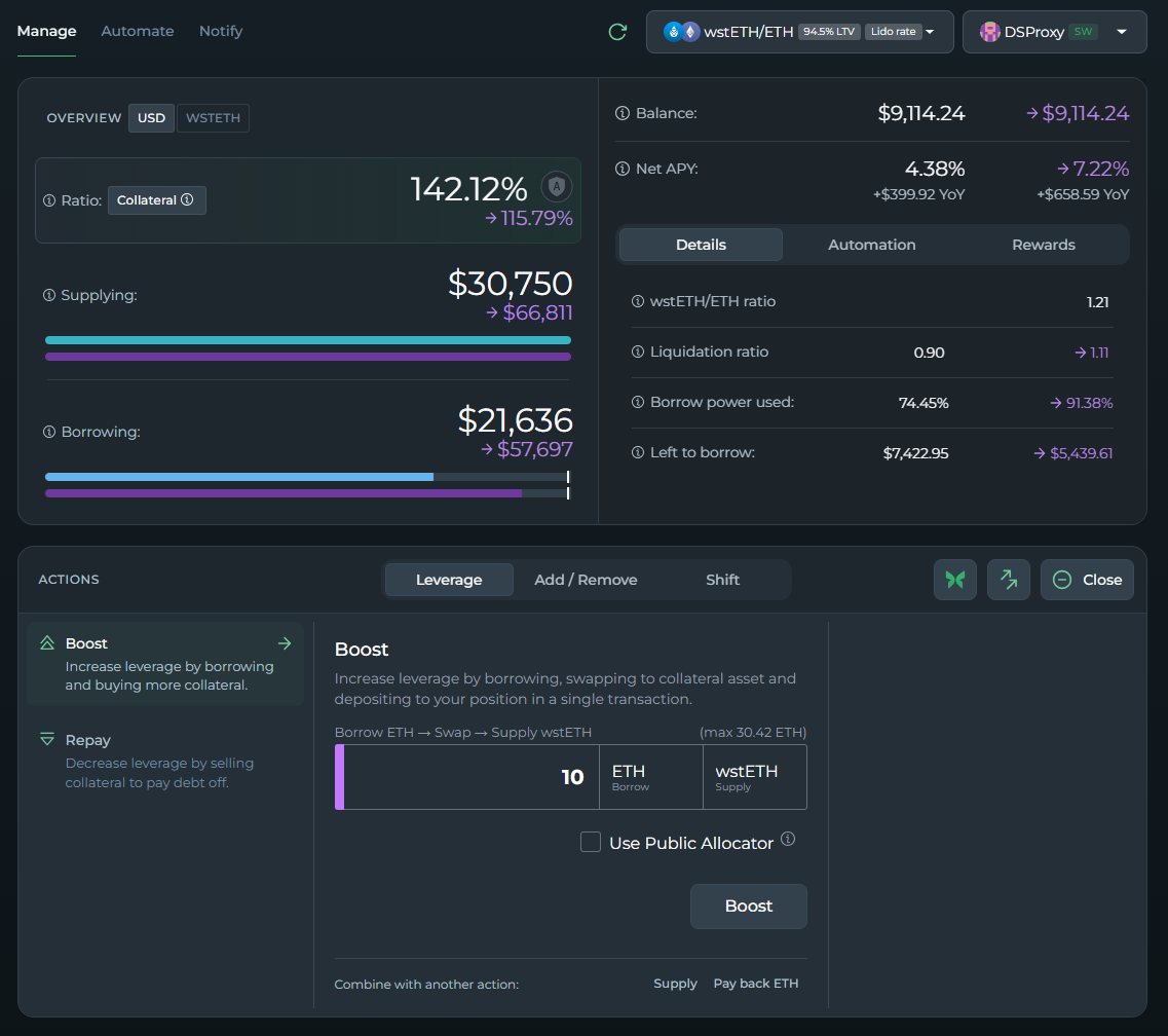 * Boost - This tool is used to increase your exposure to the collateral asset when the safety ratio of your position increases. It does this by borrowing more of the debt asset, swapping it to the collateral asset, and supplying it to your current position.