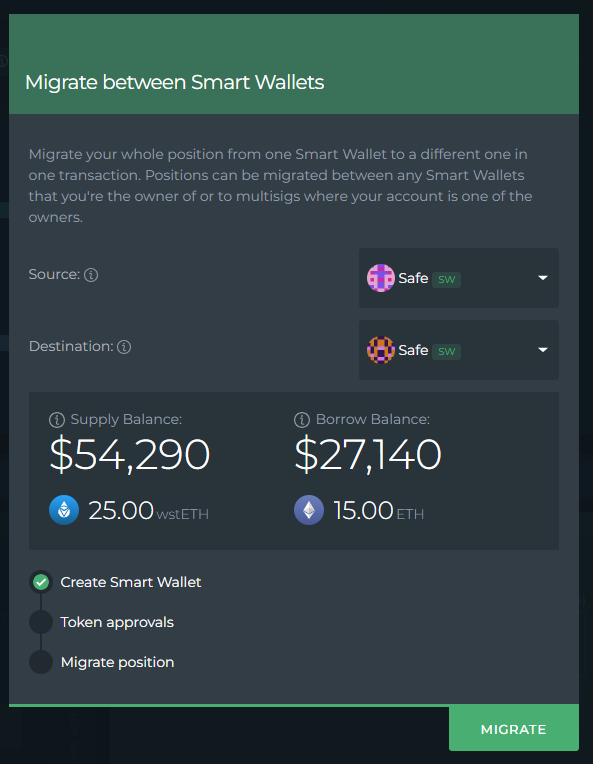 To Migrate a position, visit the main dashboard, and click the two arrow icon next to the "Close" tool: