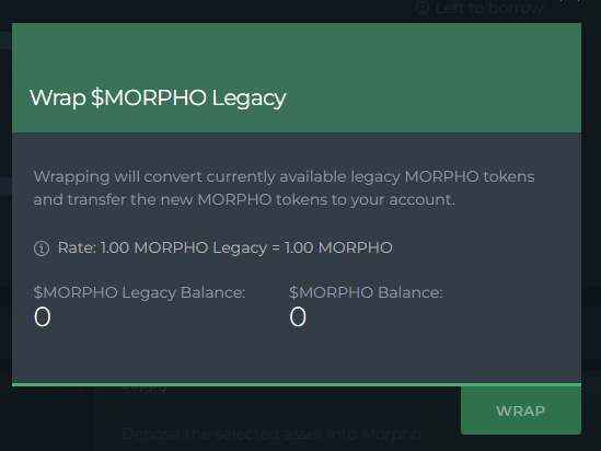 There is also a "Wrap" option, which is used to wrap your legacy MORPHO tokens into their new version, providing more options with the token, such as transferability and onchain governance.